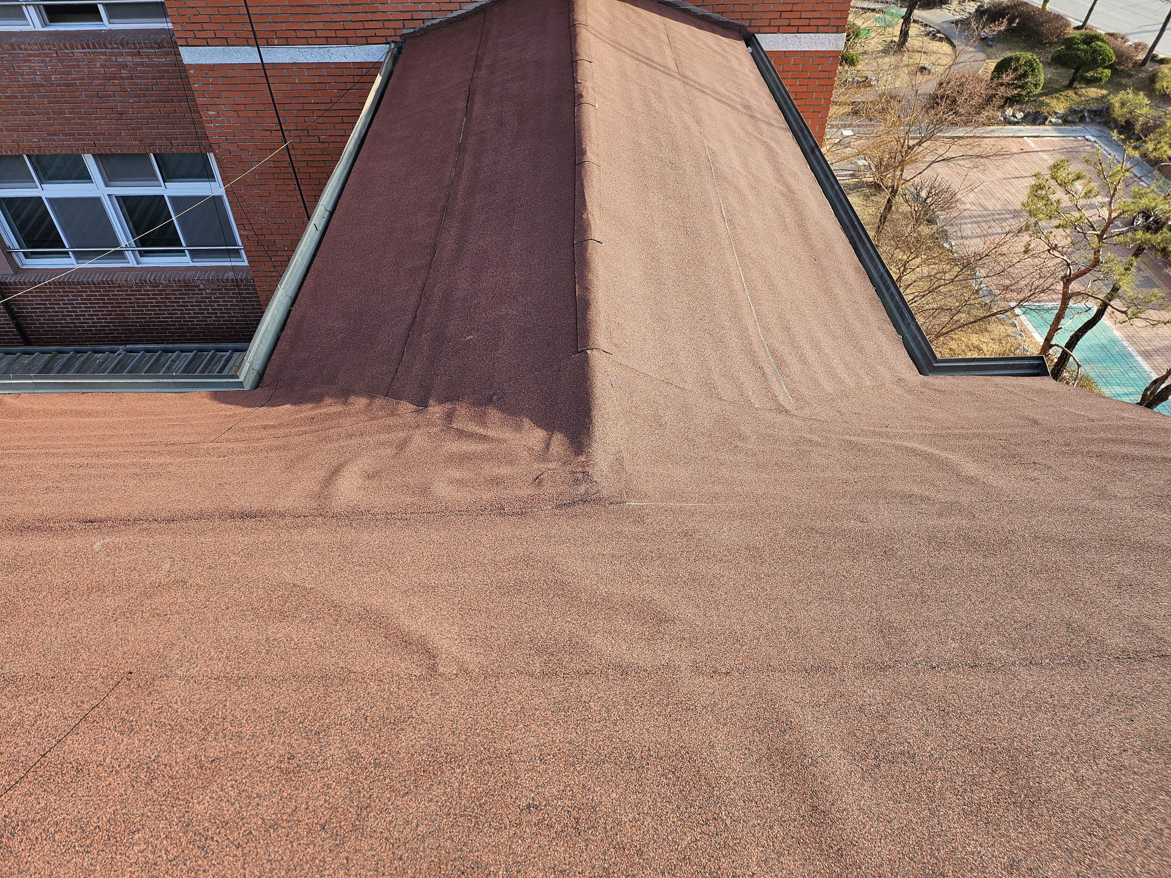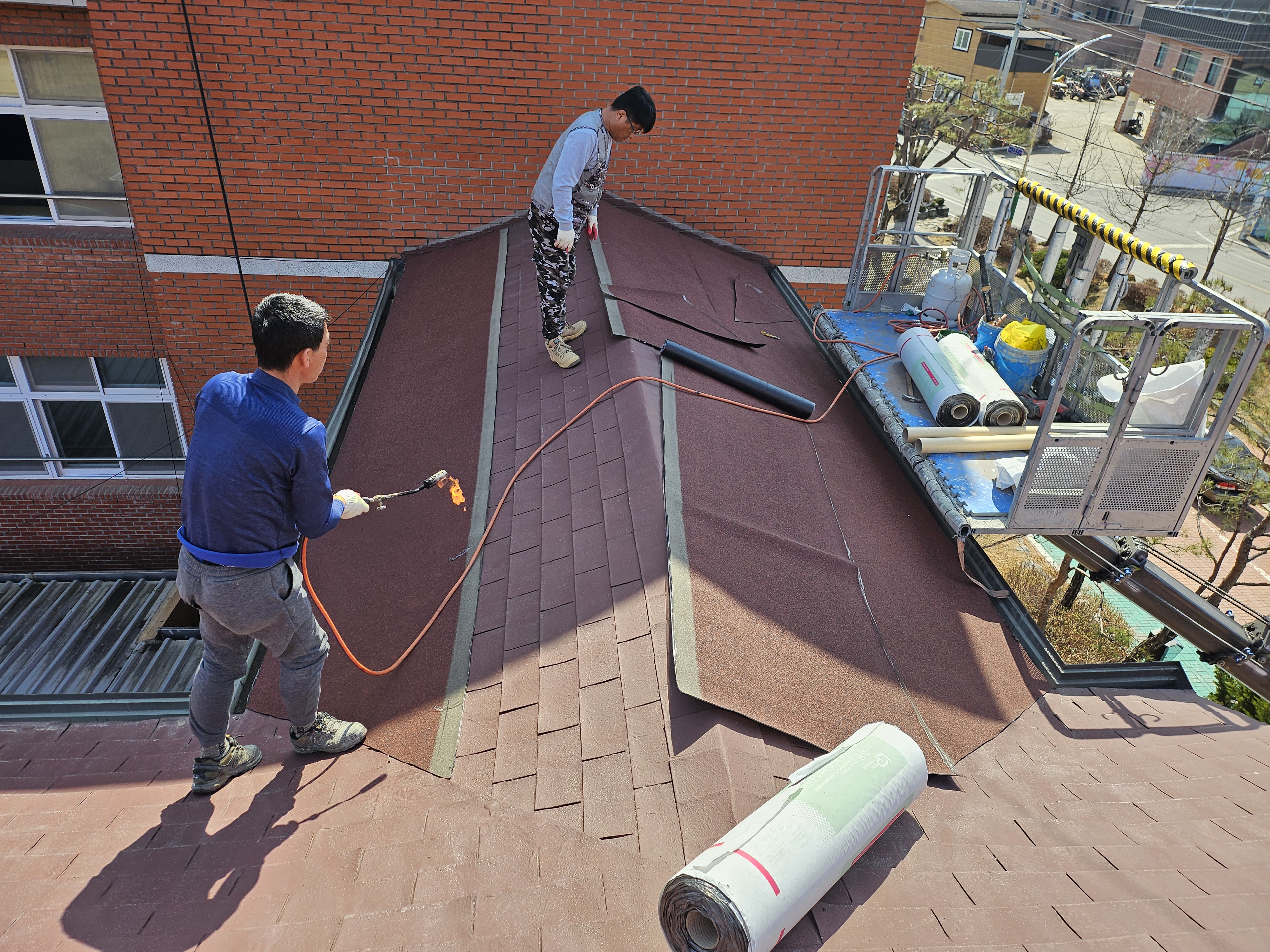 건물이 오래되면 지붕에 싱글이 기름이 빠져서 바람에 탈락이 많이 생겨서 누수가 생깁니다. 그래서 요즘은 노출시트를 이용하여 부착해 반영구적으로 유지를한다.