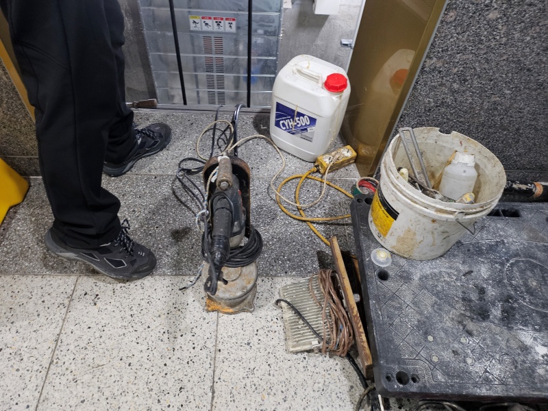 기계실 및 바닥에서 지속적인 물 고임과 누수가 발생하여