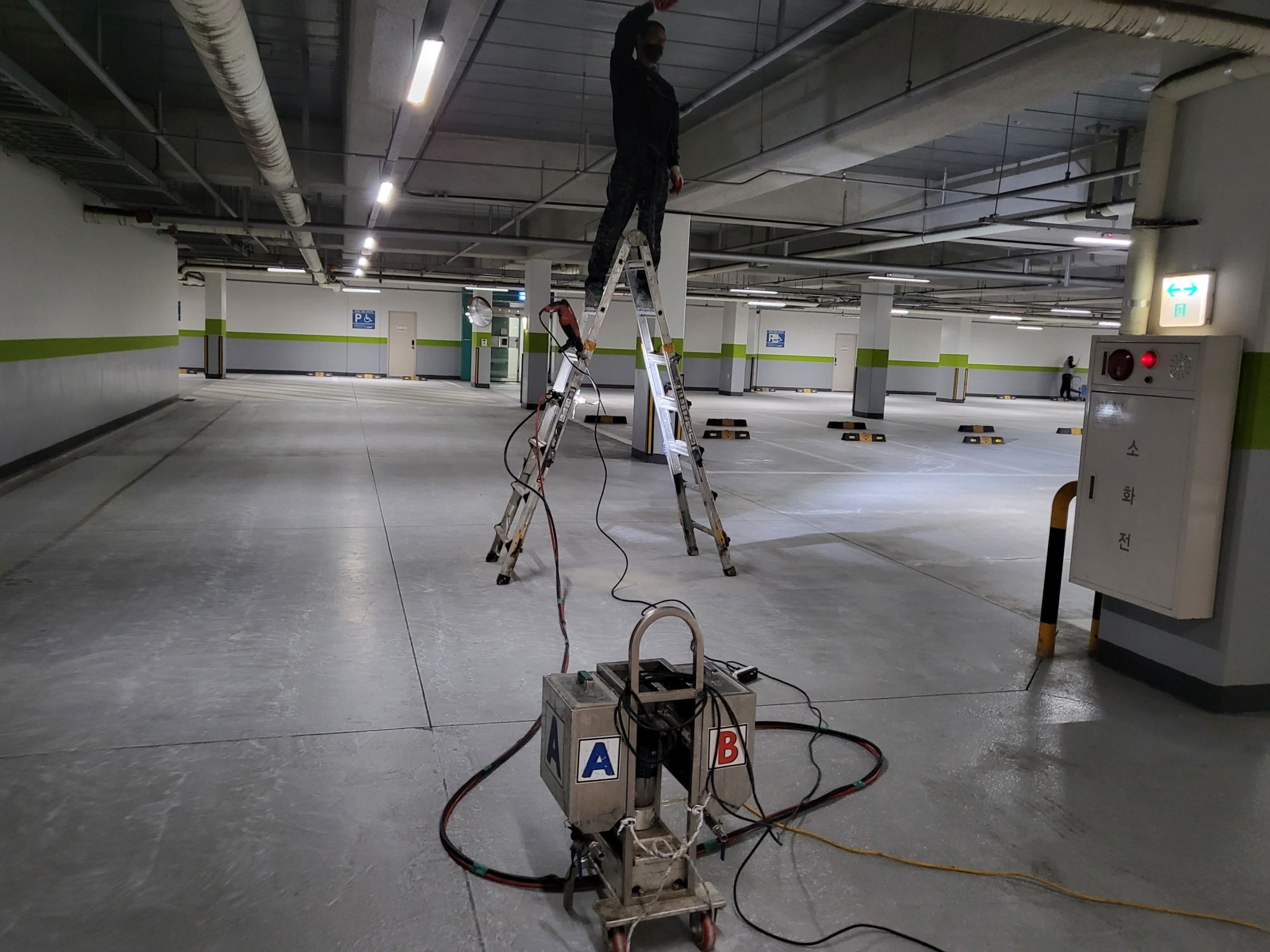 지하 주차장 천장에서 발생한 누수 부위를 확인한 후 천공 작업과 보수 공정을 진행해 지하 천장 방수 작업을 완료했습니다.