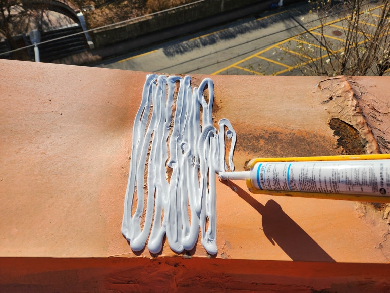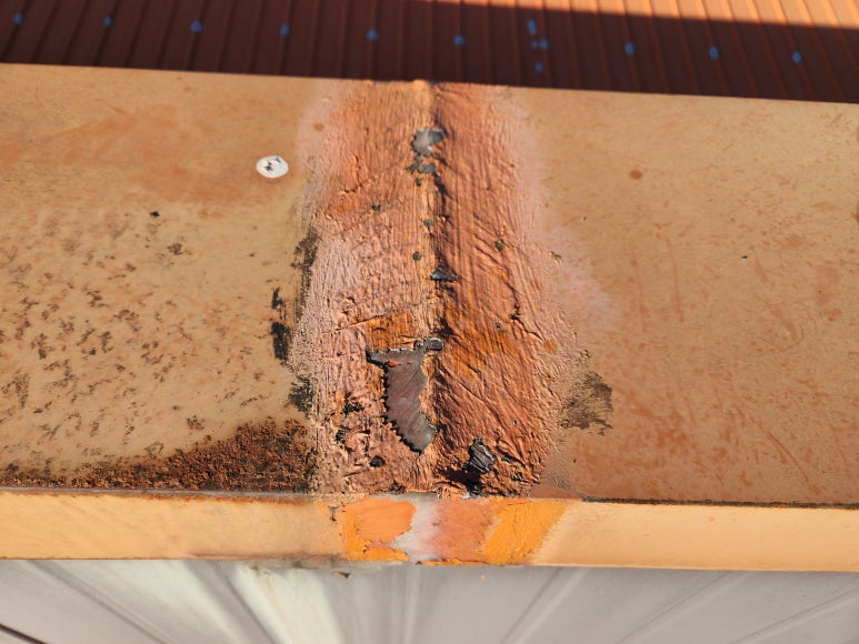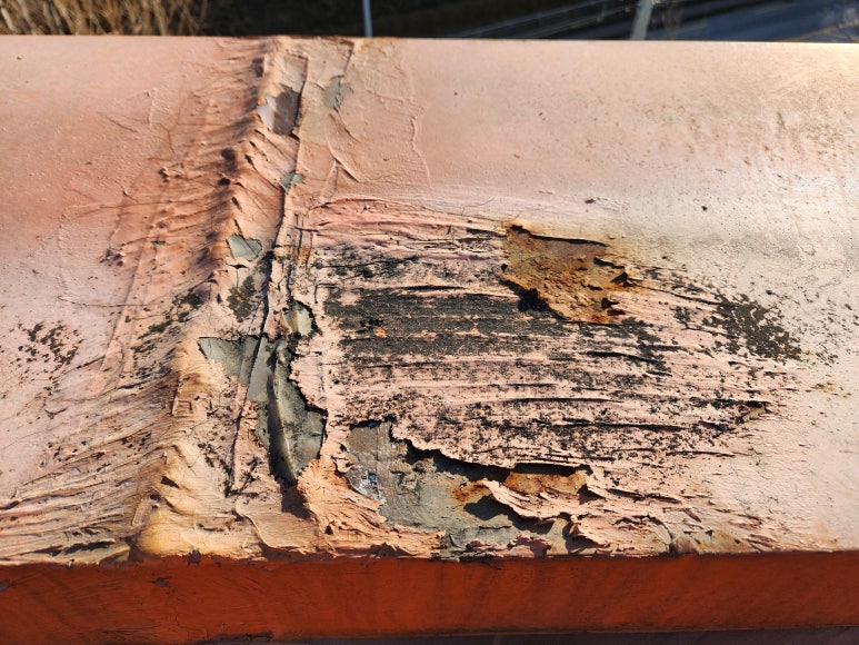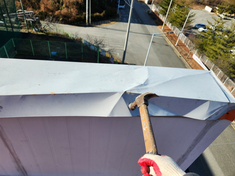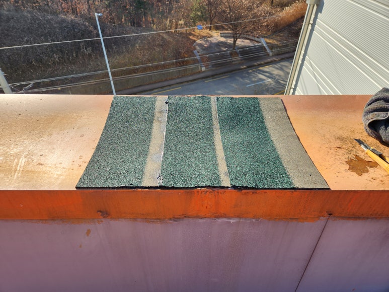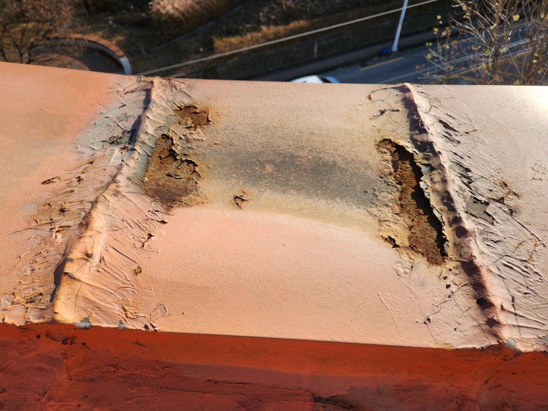 난간(후레싱) 휜 곳에 빗물이 고이다 보니