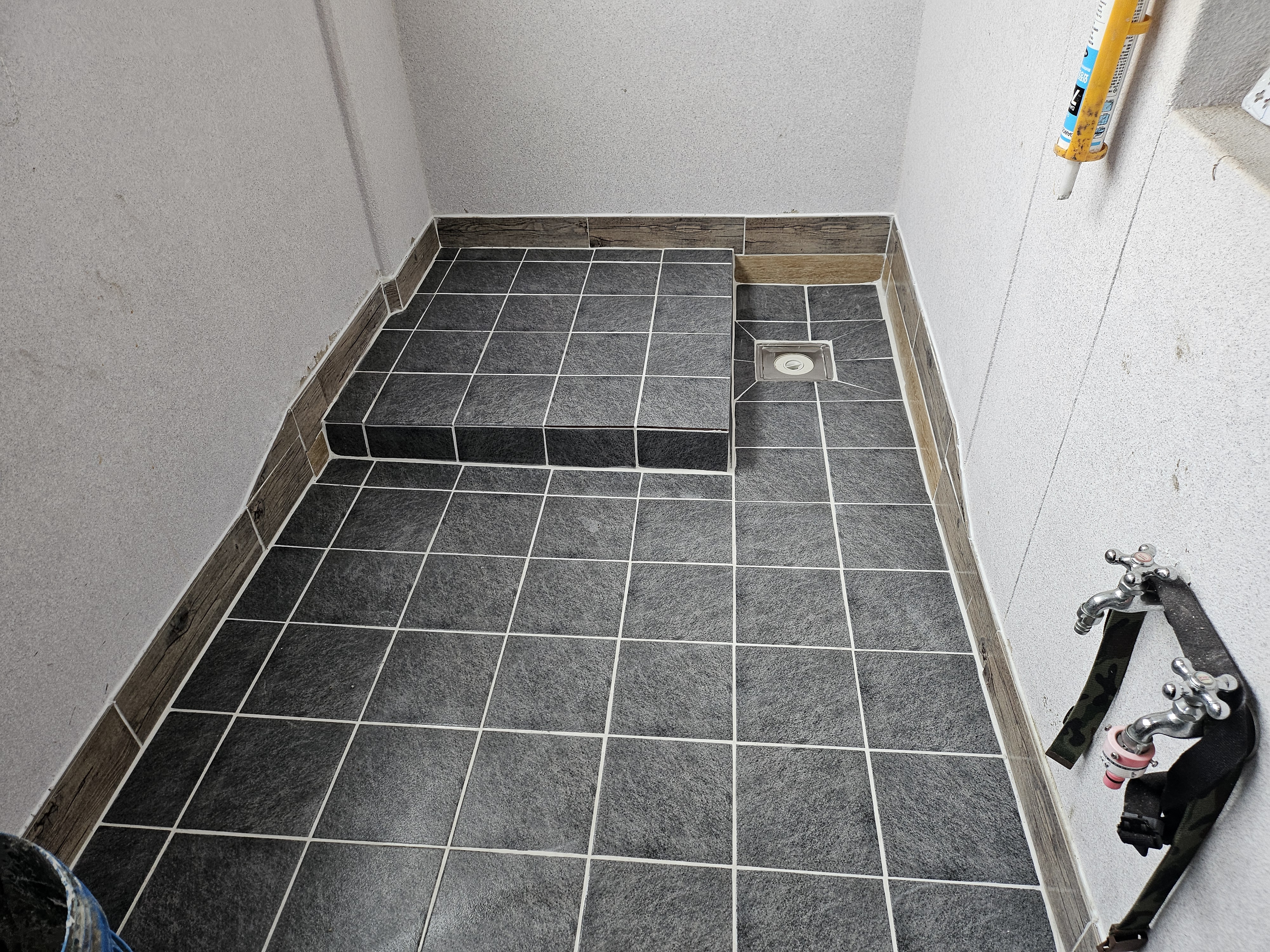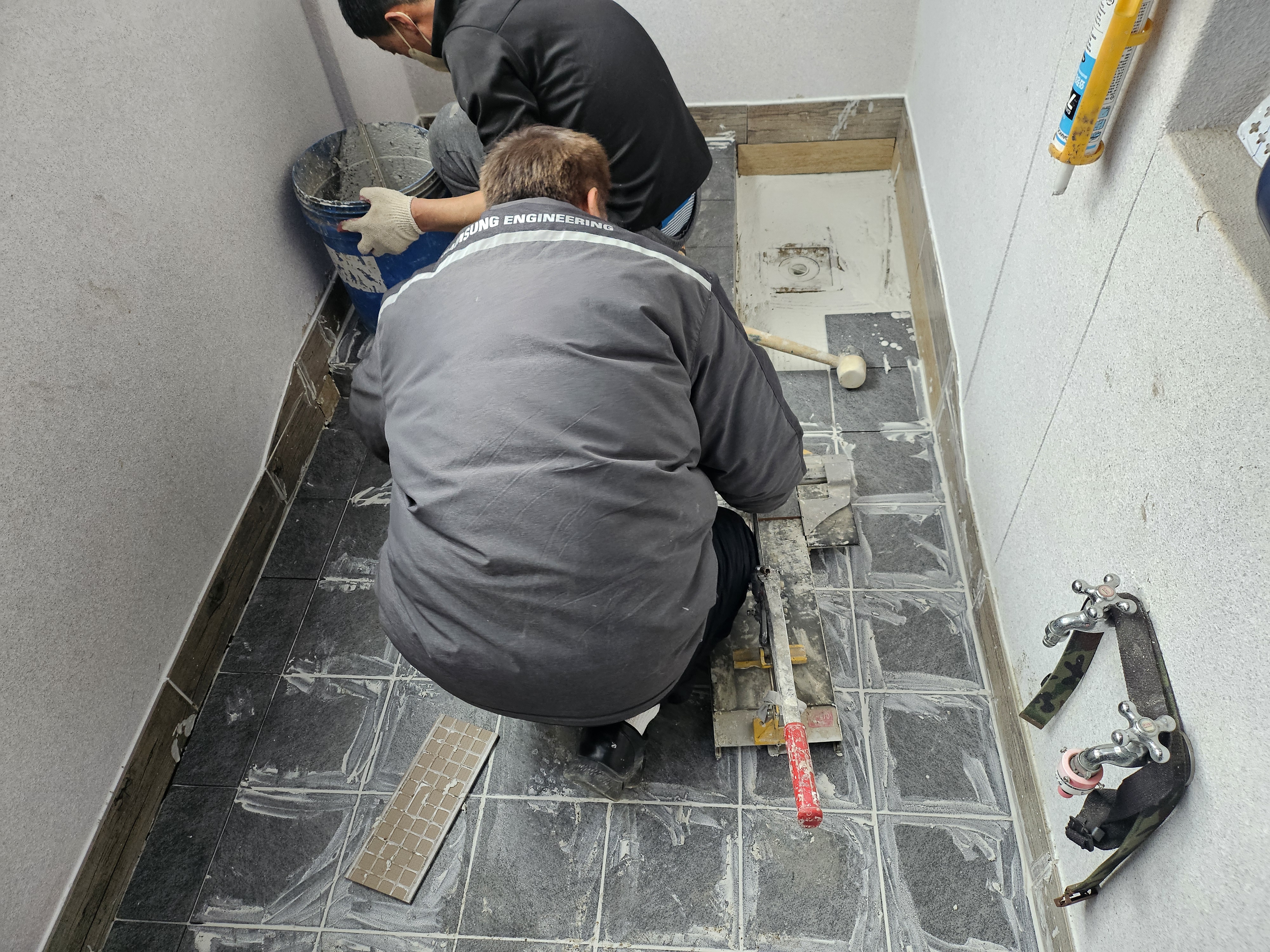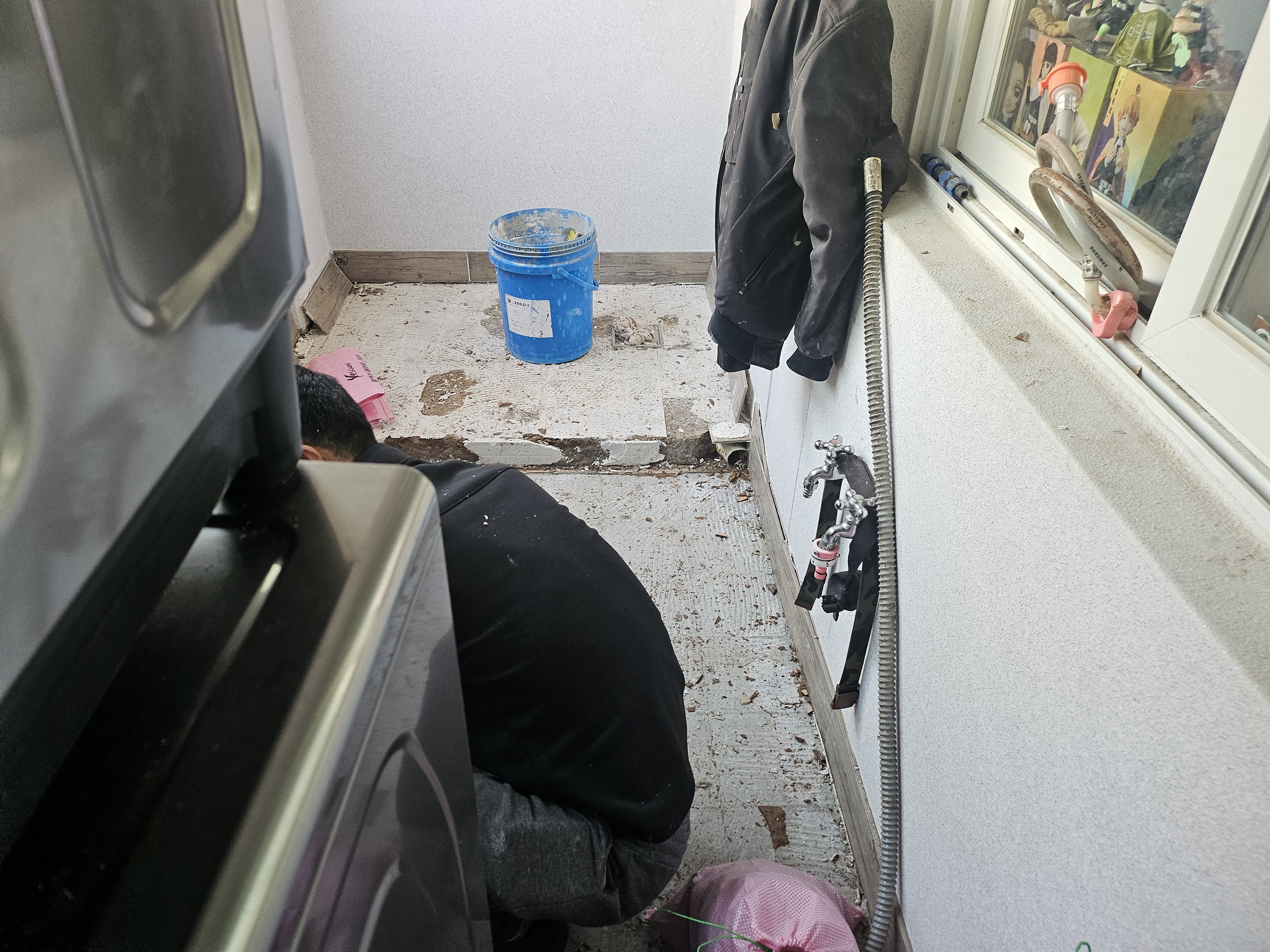 누수 세탁실 방수가 문제가 생겨서 타일을 철거후 방수한다음 다시 타일 을 시공하여 마무리하였다.